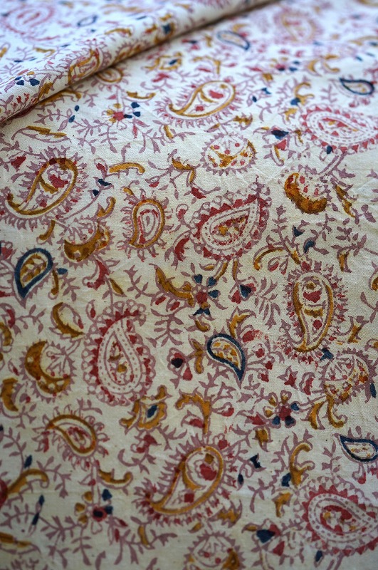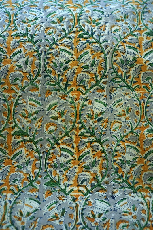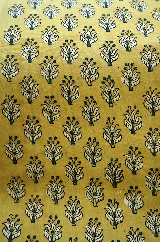 インドのブロックプリントは、主に植物や天然鉱物などの自然素材の染料を用いた、木版による型押しの伝統工芸です。花や木の実、動物などの柄を何度も重ねてスタンプすることで柄を構成していきます。一つ一つ、微妙に異なる色合いが魅力です。また、同じ木版の手法を用いたものでも、産地によって「カラムカリプリント」や「バグルプリント」、「カッチプリント」などのようにインド国内でも呼び名が異なります。