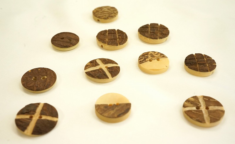インド北部では、ラクダが生活に欠かせません。荷物や人を運びます。キャメルボーン・ボタンはひとつひとつ手作りさています。自然の素材なので、表面の色や彫刻されたデザイン個体によって少しずつ異なります。
