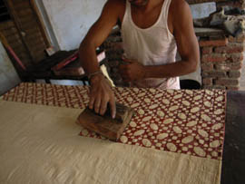 チーク材にデザイン画を貼り付けた木版に、ノミと木の棒を打ち付けながら模様を彫ることで出来上ります。木を彫る専門の職人が鳥や植物の伝統的なモチーフや幾何学模様など様々な柄の木版を作成しています。