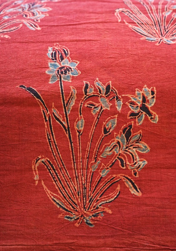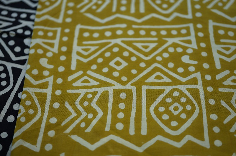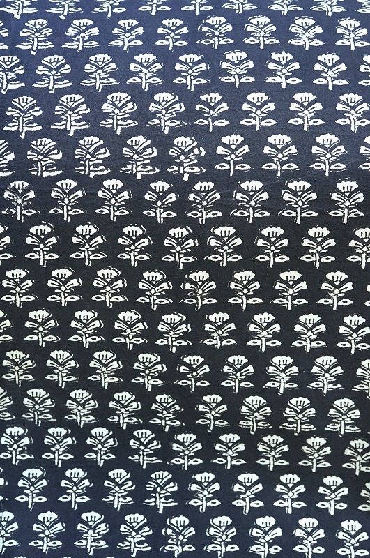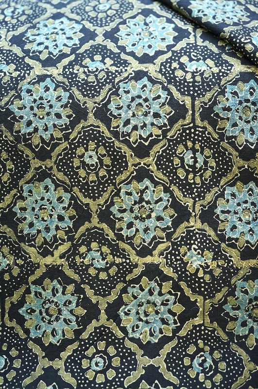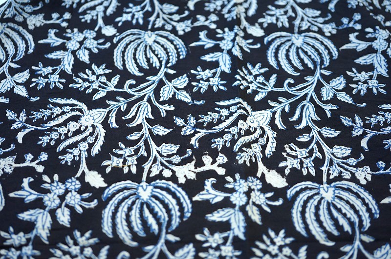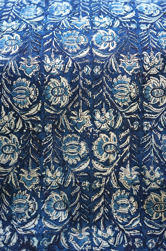 インドのブロックプリントは、主に植物や天然鉱物などの自然素材の染料を用いた、木版による型押しの伝統工芸です。花や木の実、動物などの柄を何度も重ねてスタンプすることで柄を構成していきます。一つ一つ、微妙に異なる色合いが魅力です。また、同じ木版の手法を用いたものでも、産地によって「カラムカリプリント」や「バグルプリント」、「カッチプリント」などのようにインド国内でも呼び名が異なります。
