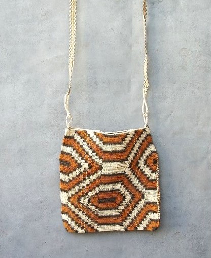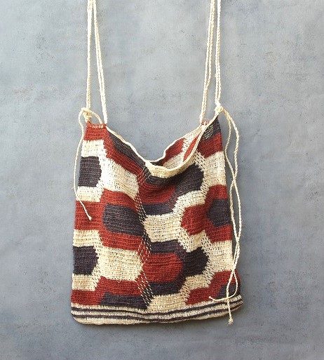 長方形のバックは主に男性用で、狩りで射止めた野生動物を入れて膨ませて帰ってくることが勝利の証とされていたものです。他にも生活に必要な木登り用の紐、網、ハンモック、抱っこひも、スカート、スパイス入れなどがあります。