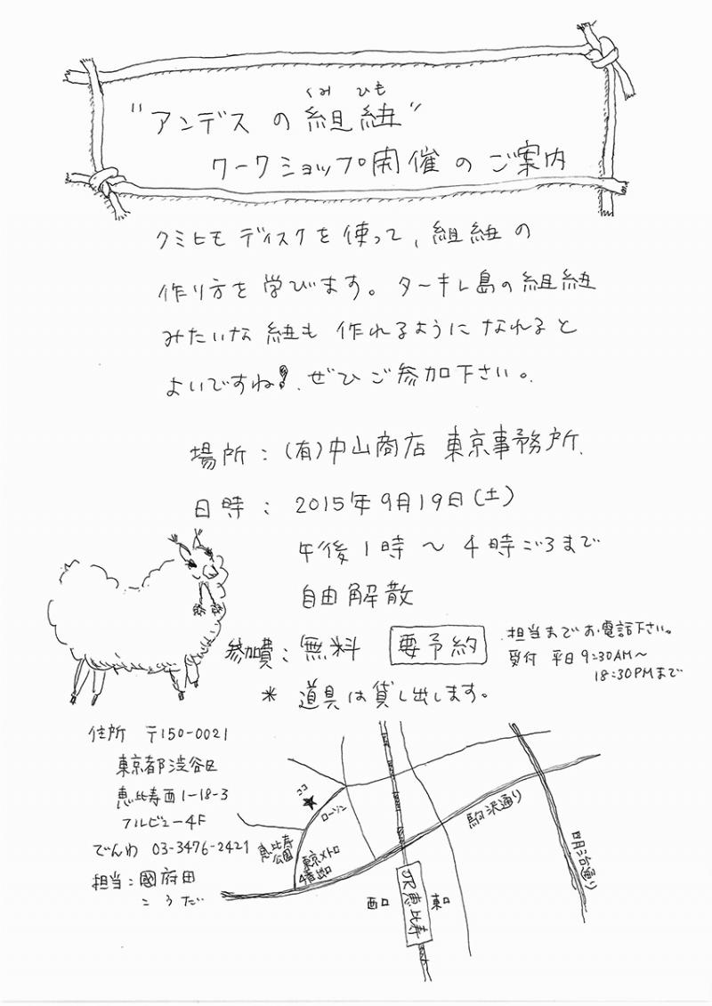 クミヒモディスクを使って組紐の作り方を学びます。参加ご希望の方、開催についてのご質問は、担当:國府田(こうだ)までご連絡ください。電話(03)3476-2421(問い合わせ時間 平日午前9:30-午後6:30)